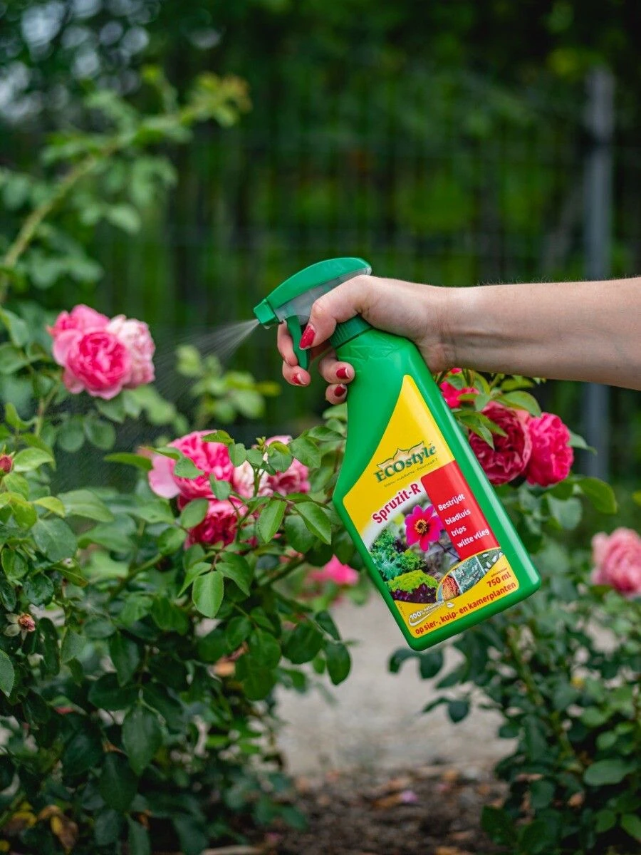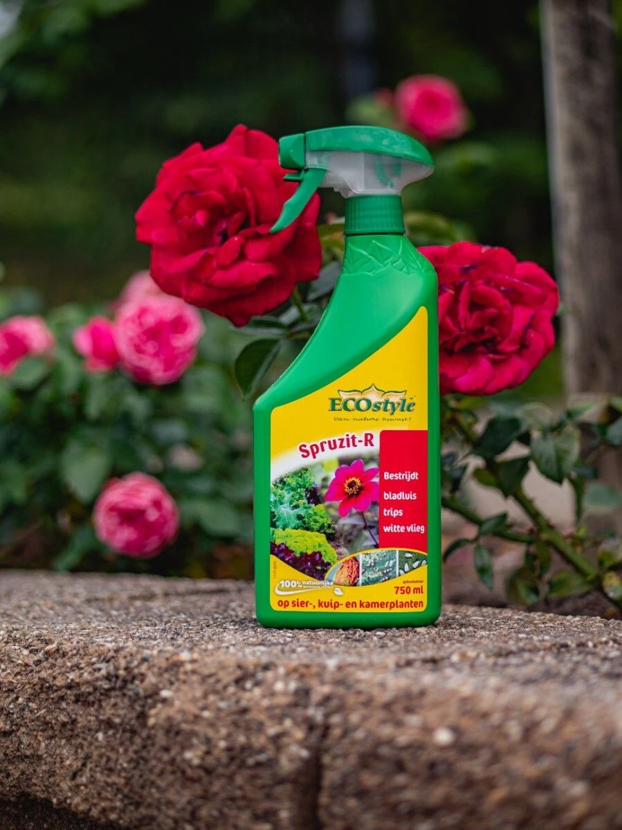 Spruzit-R gebruiksklaar van ECOstyle kun je voor planten in huis als in de tuin gebruiken. Het bevat natuurlijke werkzame stoffen als pyrethrum en koolzaadolie wat de plaag direct aanpakt. Deze plaaginsecten als bladluis, trips en witte vlieg zuigen aan het plantensap van je planten. Door de plaaginsecten zo snel mogelijk aan te pakken, voorkom je dat bladeren afsterven. Spruzit-R is een contactmiddel en je moet de plaag goed raken voor het beste effect. Gebruik het middel het liefst ’s avonds als de nuttige insecten zoals bijen naar hun nest zijn gekeerd. Zo doe je ze geen kwaad. Te gebruiken op sierplanten binnen en buiten, kamerplanten en kuipplanten.