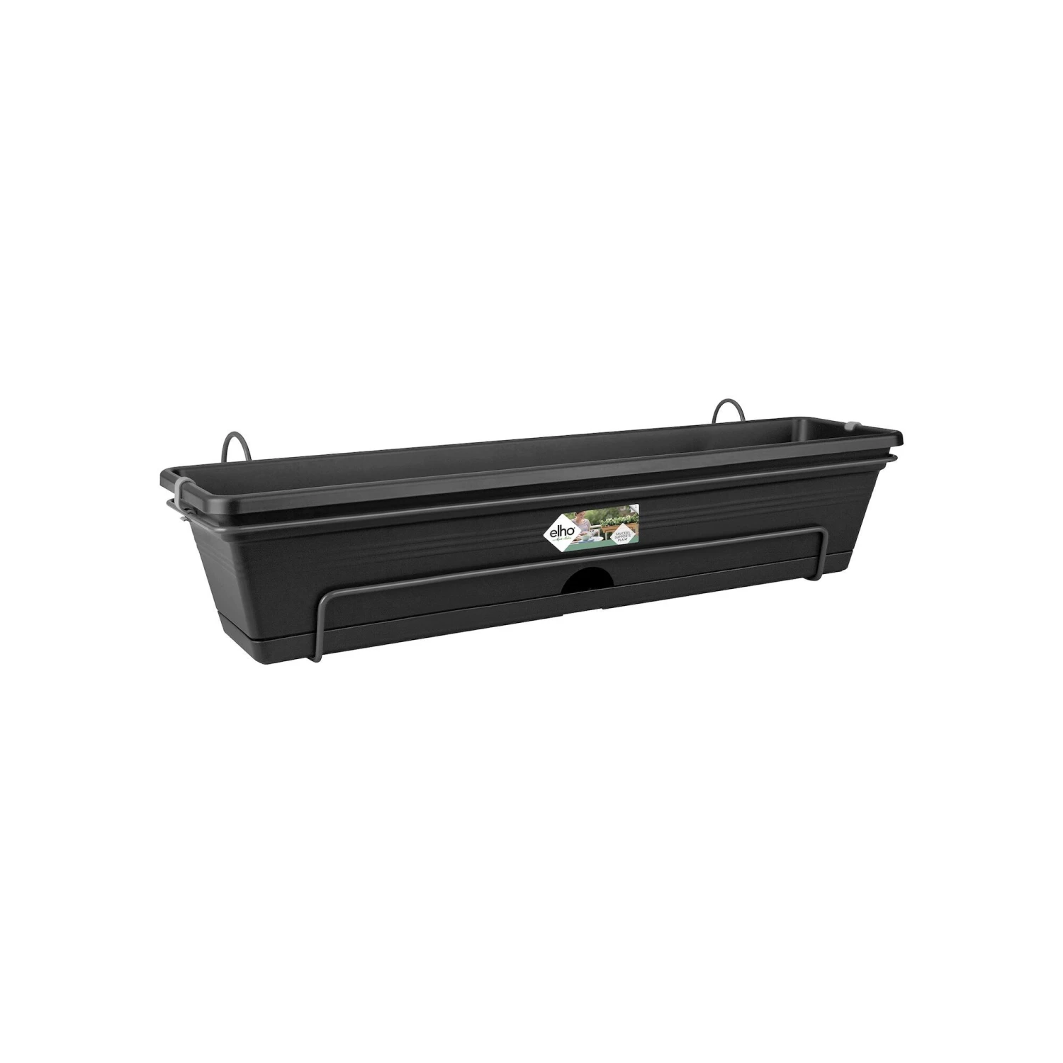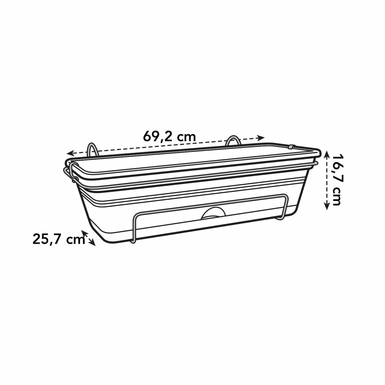 De balkonbak past op een railing met een breedte tot 6 cm. De balkonbak wordt geleverd als complete set, alleen planten uitzoeken en klaar! De set bestaat uit een plantenbak, schotel, ophangrekje en bevestigingsclips. Aan de zijkant zit een handige opening waardoor je gemakkelijk water kunt geven met een gieter. Door de geïntegreerde schotel loopt de pot niet over. De balkonbak is gemaakt met gerecycled plastic, met windenergie en 100% recyclebaar.
