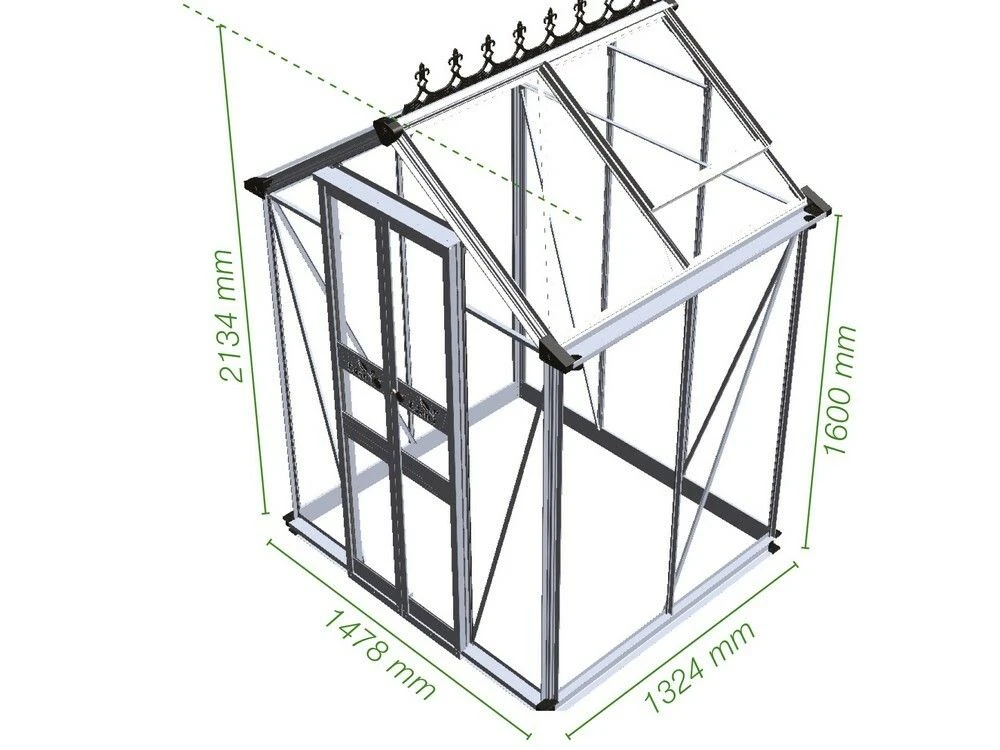 Tuinkas Birdlip 44 heeft 3 mm dik veiligheidsglas. De afdichting wordt gefixeerd met kunststof beglazingsstrips. De goot- en nokhoogte zijn inclusief de hoogte van de meegeleverde fundering. Deze kas is in een zwarte uitvoering. Maar de tuinkas is er ook in het blank of donkergroen gecoate uitvoering.