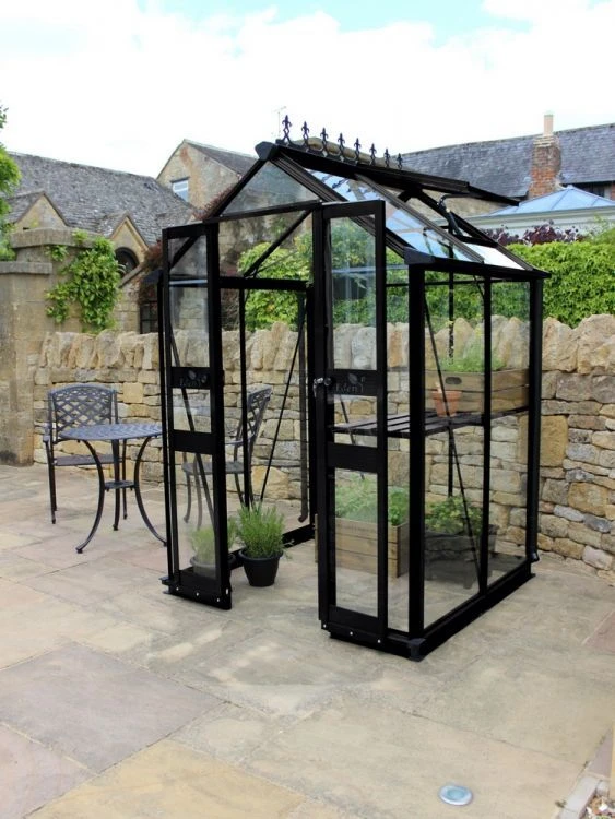 De kleinste tuinkas met stahoogte die er is, is de Halls Greenhouses Birdlip 44. Het is een vrijstaande kas met drempelloze dubbele schuifdeur met slot. Door de hoge deur hoef je niet gebukt naar binnen te gaan. Er zit één dakraam in. Voor de extra brede goot met een breedte van 80 mm worden gratis twee regenpijpen met een diameter van 40 mm meegeleverd. Ook zit er een gratis funderingsrand bij. Hierdoor staat de kas stevig en stabiel. De aluminium funderingsrand is 8 cm hoog. De rand wordt standaard in dezelfde kleur geleverd als de kas. De mooie Victoriaanse nok, om vogels van het dak te weren, zit er niet standaard bij.