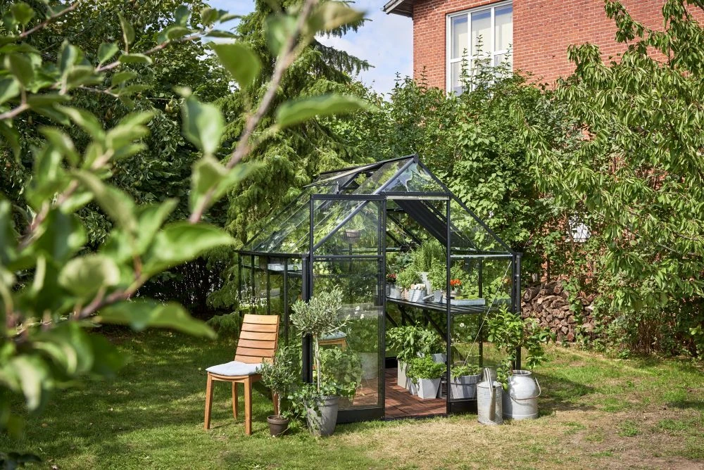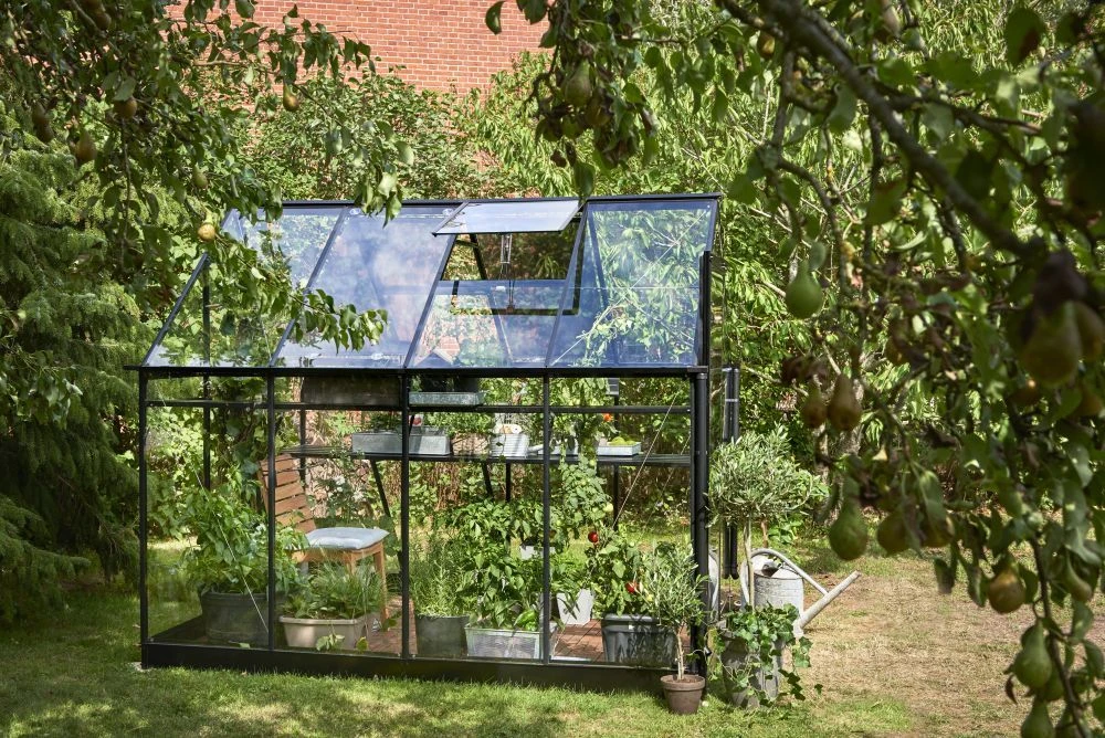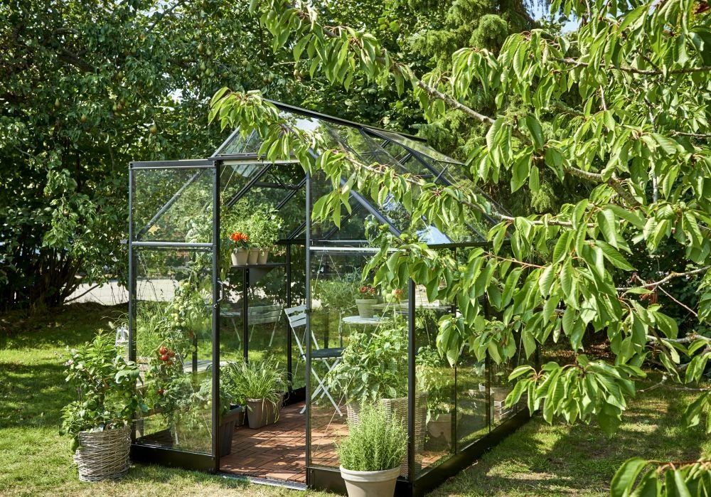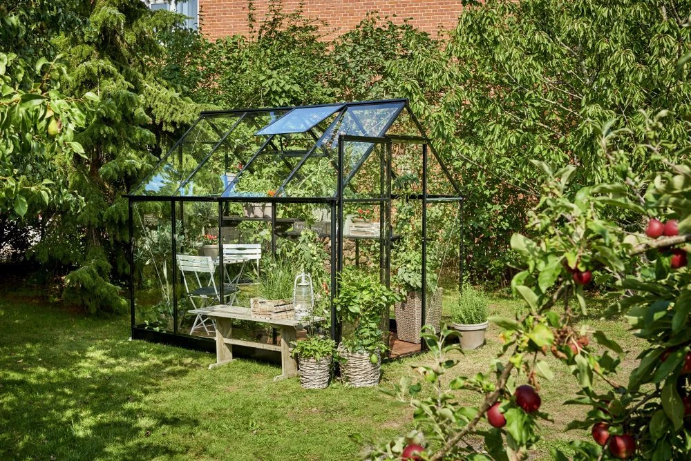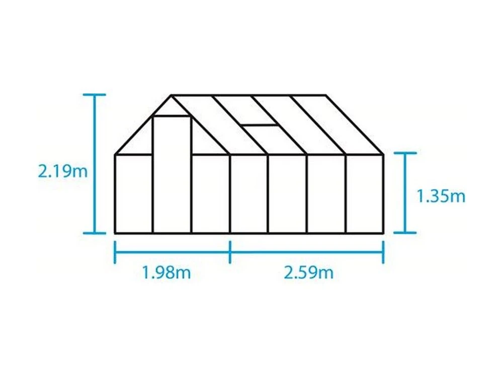 De hele kasframe van de Hall Greenhouses Qube 86 Tuinkas wordt samengesteld uit één aluminium vierkant (Qube) profiel. Deze tuinkas heeft veiligheidsglas wat vastgezet wordt met tape en met een dubbele beglazingsstrip. De kas heeft twee brede goten van 80 mm breed en zijn voorzien van aansluitstukken voor de regenpijpen (exclusief regenpijpen). De tuinkas heeft een schuifdeur met handgreep en is 180 cm hoog. De deur heeft een telescopische deurrail. De kas is erg toegankelijk omdat er een zeer lage drempel in zit. De Qube is standaard voorzien van een zwarte coating.