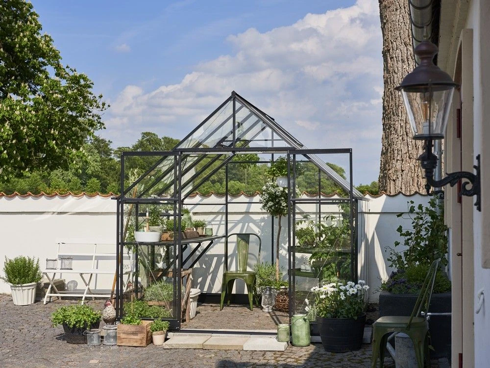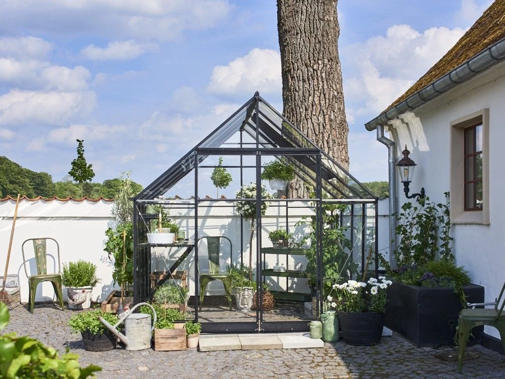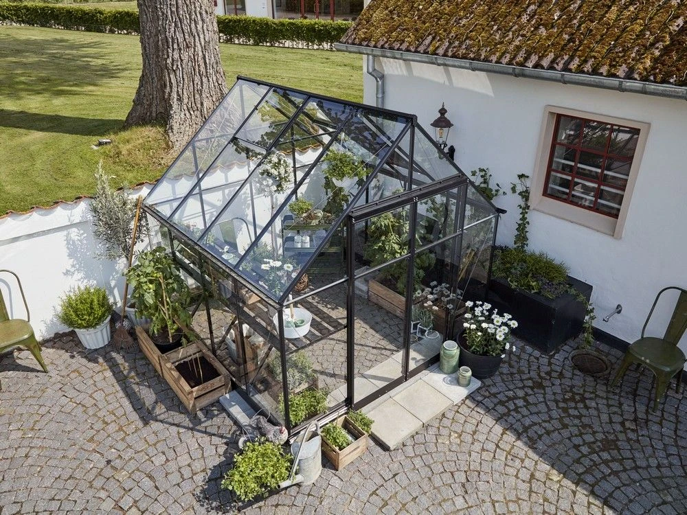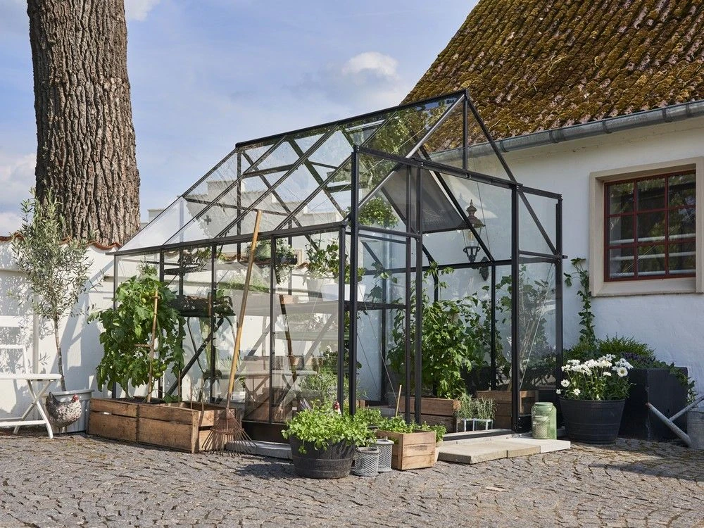 De hele kasframe van de Hall Greenhouses Qube 88 Tuinkas wordt samengesteld uit één aluminium vierkant (Qube) profiel. Deze tuinkas heeft veiligheidsglas wat vastgezet wordt met tape en met een dubbele beglazingsstrip. De kas heeft twee brede goten van 80 mm breed en zijn voorzien van aansluitstukken voor de regenpijpen (exclusief regenpijpen). De tuinkas heeft een schuifdeur met handgreep en is 180 cm hoog. De deur heeft een telescopische deurrail. De kas is erg toegankelijk omdat er een zeer lage drempel in zit. De Qube is standaard voorzien van een zwarte coating.