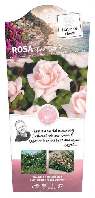 De ‘New Dawn’ is de Assepoester onder de rozen. Wanneer ze tot bloei komt heeft ze het sprankelende wow-effect. Dankbaar en liefdevol, vrouwelijk en vol pracht. De mooie en subtiele lichtroze bloemen zijn schitterend. Ze is een pareltje dat zeker niet mag ontbreken in een rozentuin. Ze behoort niet voor niets tot de meest bekende klimroos in rozenland.