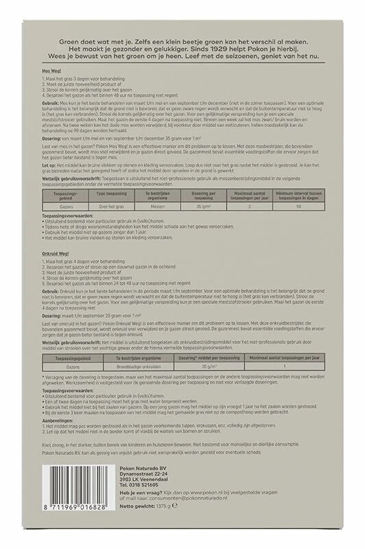 Pokon Mos & Onkruid Weg! is een pakket met zowel een gazonvoeding met onkruidbestrijder als een gazonvoeding met mosbestrijder. Door mos en onkruid verstikt het gras waardoor het gazon wordt verstoord. Pokon Mos Weg! geeft voeding aan het gazon en werkt snel en effectief tegen mossen in gazons. Onkruid Weg! geeft voeding aan het gazon en is werkzaam tegen boterbloem, madeliefje, witte klaver en paardenbloem.