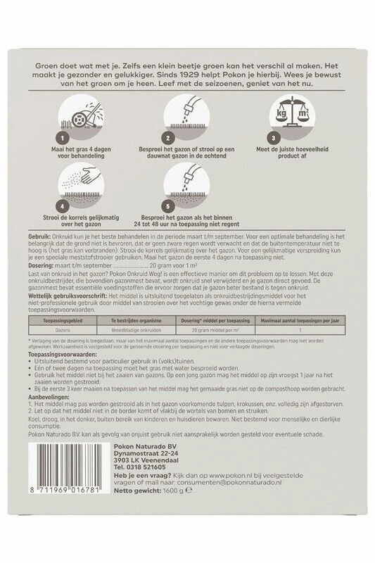 Pokon Onkruid Weg! is een gazonmest met een NPK van 22-5-5 .i.c.m. met een onkruidbestrijder. Werkzame stof: 8 gr/kg 2,4-D en 1,2 gr/kg dicamba. Gebruik gewasbeschermingsmiddelen veilig. Lees vóór gebruik eerst het etiket en de productinformatie.