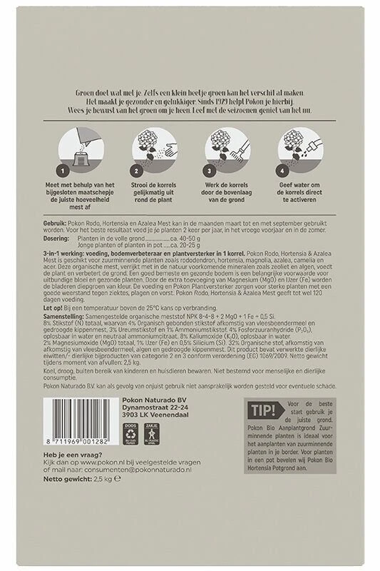 Pokon Rodo, Hortensia & Azalea Mest, verrijkt met in de natuur voorkomende mineralen (zeoliet en algen), voedt de plant en verbetert de grond. Deze organische voeding zorgt ervoor dat je Hortensia’s, Rododendrons, Azalea’s en andere zuurminnende planten uitbundig bloeien en meer weerstand krijgen. Door de extra toevoeging van Magnesium (MgO) en IJzer (Fe) krijgen je bloemen een intensere kleur.